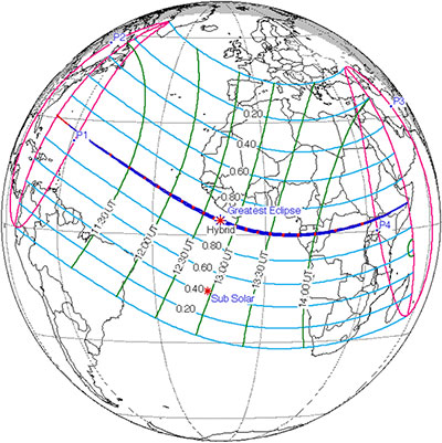 Es un suceso único que ocurre unas diez veces durante un siglo pero que desde nuestro continente sólo se podrá ver una ocultación parcial debido a la forma achatada de la Tierra. Se trata de un eclipse ‘híbrido’ que comenzará a verse de forma anular, posteriormente pasará a ser total para luego acabar siendo de nuevo anular.