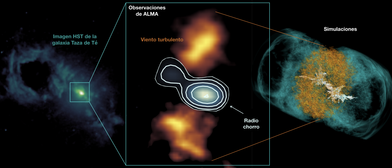 Un radio jet compacto en el centro de la galaxia Taza de Té produce un viento turbulento lateral en el gas frío, tal y como predicen las simulaciones. Crédito: HST/ ALMA/ VLA/ M. Meenakshi/ D. Mukherjee/ A. Audibert.