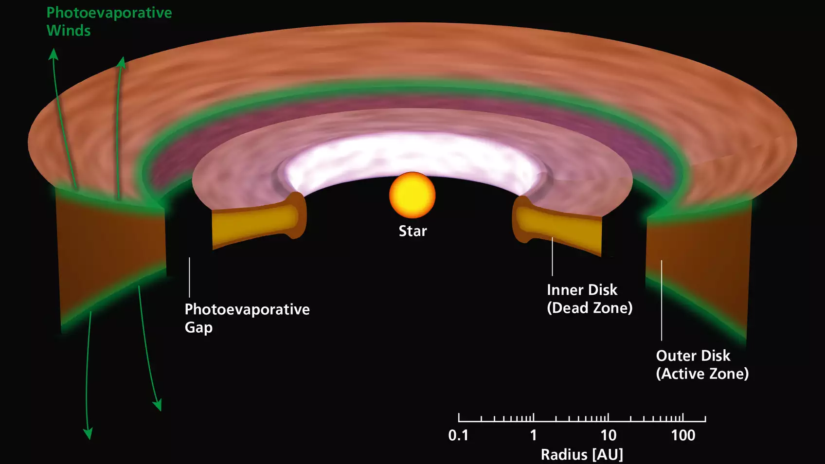 Esquema de un disco de transición alrededor de una estrella del tipo de nuestro Sol. La emisión en rayos X desde la estrella central ilumina el disco. La irradiación ioniza el gas del disco. Ello provoca la aparición de vientos por fotoevaporación, que expulsan gas hacia el espacio exterior. Eventualmente, se abre un hueco («photoevaporative gap» en el dibujo) que desconecta el disco interno de la reserva exterior de gas y polvo. Una zona muerta («dead zone») dentro del disco interior («inner disk») impide que el material se precipite rápidamente hacia la estrella. Este proceso alarga la vida del disco interior. Crédito: MPIA.