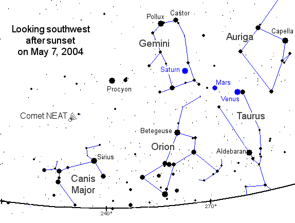 El largamente esperado cometa NEAT (C/2001 Q4) está acercándose a la Tierra y su brillo sigue aumentando. En el punto de máximo acercamiento, que tendrá lugar mañana 7 de mayo, estará a 0.32 UA (48 millones de km) de distancia de nuestro planeta, y brillará como una estrella de magnitud 3. El cometa es visible a simple vista después del ocaso solar en sitios con cielo oscuro en el hemisferio norte. Se le ve como una bola difusa con una cola chaparrada. Los observadores que se encuentren en la ciudad sólo lo podrán ver con ayuda de binoculares o un pequeño telescopio.